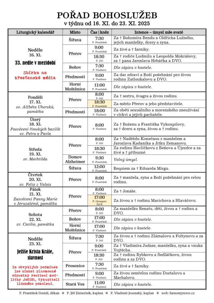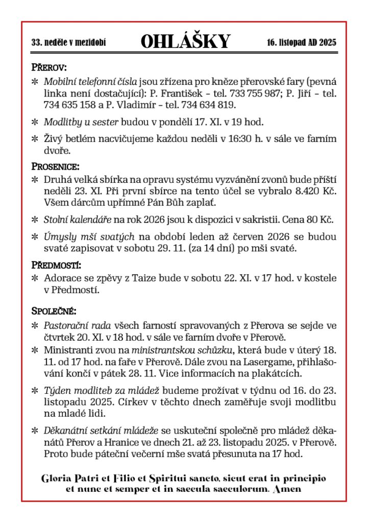 Změny v bohoslužbách jsou ohlášeny při nedělních ohláškách.