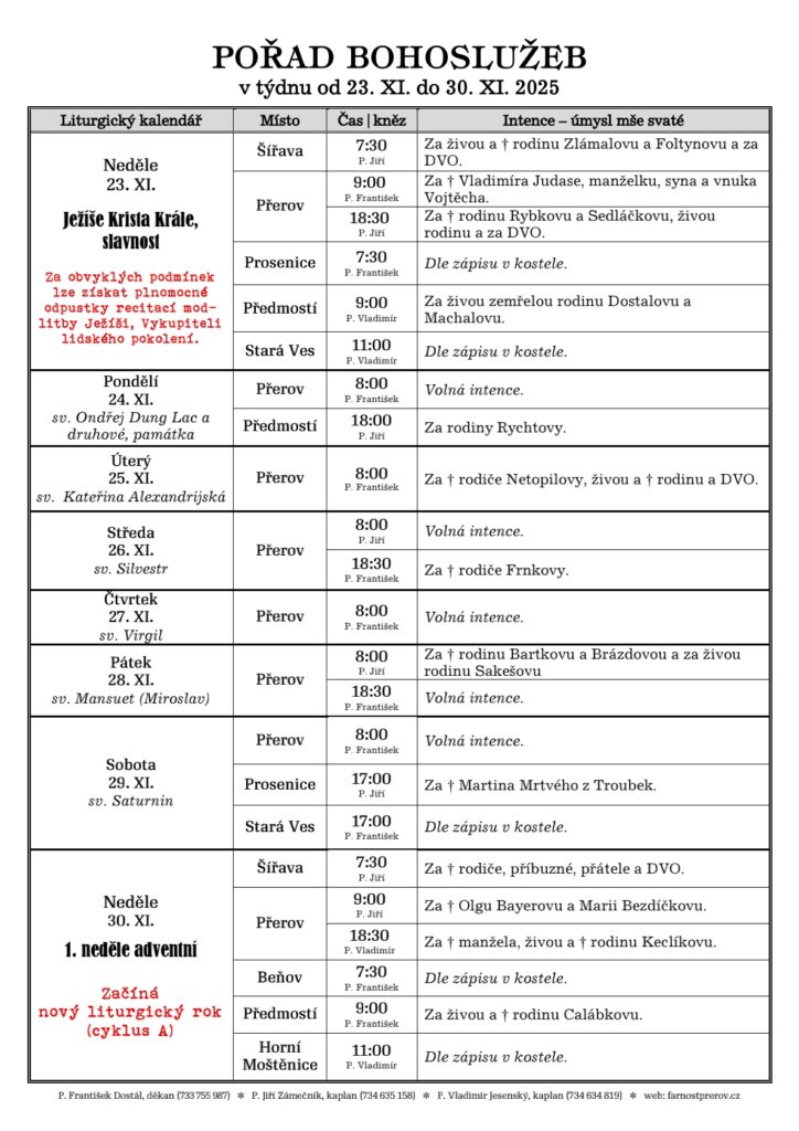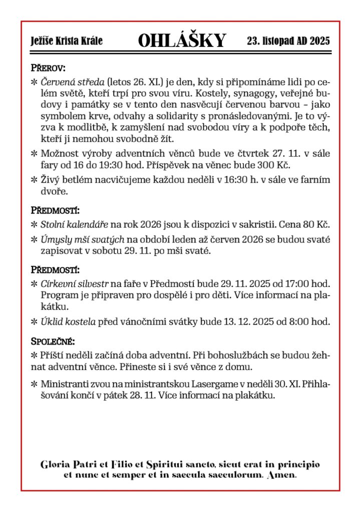 Čtvrtek „Nový rok“ 1. 1. 2026 MATKY BOŽÍ PANNY MARIE NEBUDE –Stará Ves, možnost v Horní Moštěnici v 11:00 hod